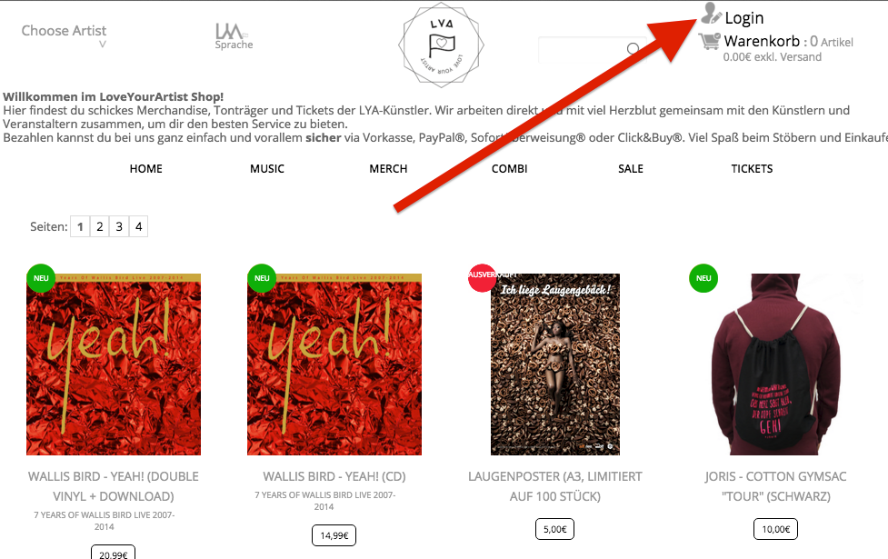 Über den ‘Login’ button (oben rechts) kannst du dich mit deiner Email-Adresse und deinem Passwort jederzeit einloggen und deine Bestellungen einsehen bzw. deine Tickets erneut abrufen. Solltest du dein Passwort vergessen haben, kannst du es dir einfach nochmal an deine Email-Adresse zusenden lassen.